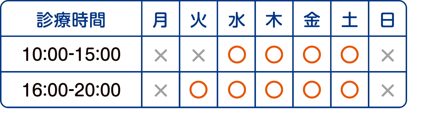 | ※火~土の祝祭日は診療致します。 ※当院は予約診療制です。キャンセル・変更の場合はご連絡ください。 ※急患の方にも可能な限り対応させて頂きますが、予約状況によっては対応できない場合もございます。まずはお電話でご確認ください。 ※学会出席・研修参加等で休診させていただく場合があります。 |